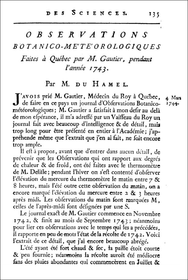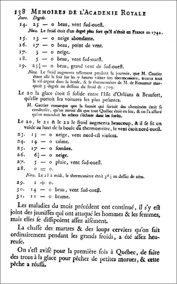 Le botaniste Jean-François Gaultier appareille pour le nouveau continent en 1742 à bord du Rubis. Il entretient, à titre de membre correspondant, des relations avec plusieurs savants de l'Académie. Gaultier s'intéresse entre autres à la météorologie : pendant quatorze ans, il va tenir le journal quotidien des variations de température en Nouvelle- France. Elles feront l'objet de publications dans Les Mémoires de l'Académie royale des sciences. On imagine aisément les difficultés rencontrées quand on sait que le thermomètre au mercure perfectionné par Gabriel Fahrenheit (1686-1736) et couramment utilisé depuis 1720, ne permettait pas de mesurer exactement les basses températures du froid hivernal de Québec.